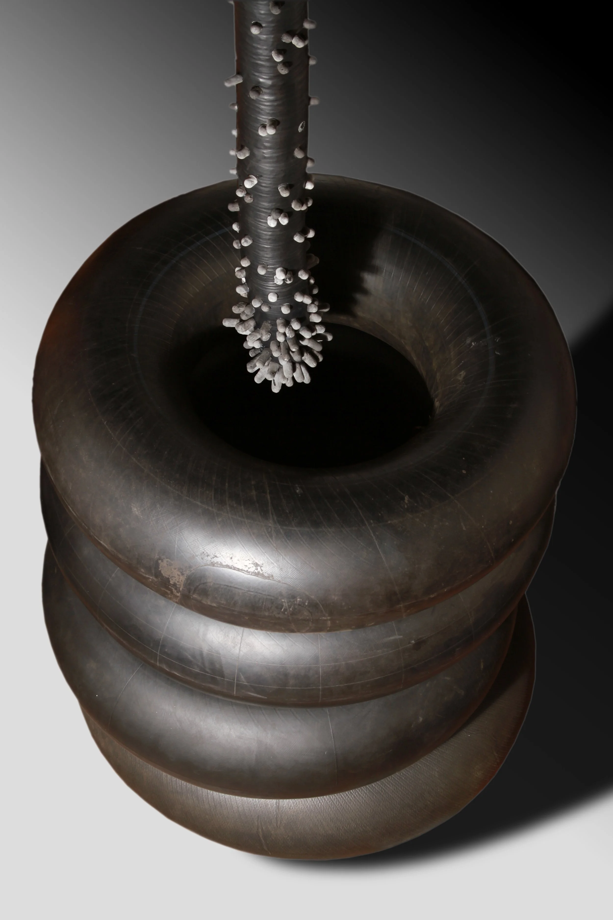 En la exposición Sicalipsis hay una especie de cuerpo descarnado en el cruzamiento entre los objetos y los espacios de los gimnasios, el circo, los saunas, y los espacios de tortura física violenta. En estos espacios y en lugares de encuentro furtivo hay situaciones forzadas o consentidas que nos concierne, que nos afectan, que dan forma al afecto o al desafecto, al amor o al odio. En uno de los videos de esta exposición, la cámara se detiene en un punto fijo de una pera de boxeo, golpeada por un puño, se detiene en un puntum donde el objeto lentamente empieza a palpitar como si respirara. Esta es una metáfora sobre la reacción que se causa en los cuerpos en respuesta o bien a la caricia o bien al golpe, como maneras de afectación del cuerpo. Naturalmente a partir de estas iniciales reflexiones, casi todas ellas apuntan a ese espacio intermedio entre el cuerpo, lo singular y su posibilidad de generar una imagen, es decir, de la manera en que lo singular se constituye como imagen reconocida por todos. “Sicalipsis intenta montar un escenario donde mostrar el espacio intermedio entre el cuerpo y su posibilidad de construir una imagen, con los objetos, los sonidos y el espacio”.